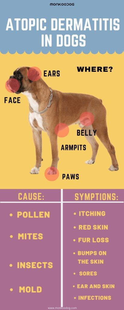This is a hereditary type of eczema that is caused by a genetic predisposition to allergies. Dogs with atopic dermatitis can be allergic to a variety of environmental allergens, such as pollen, dust mites, or mold.